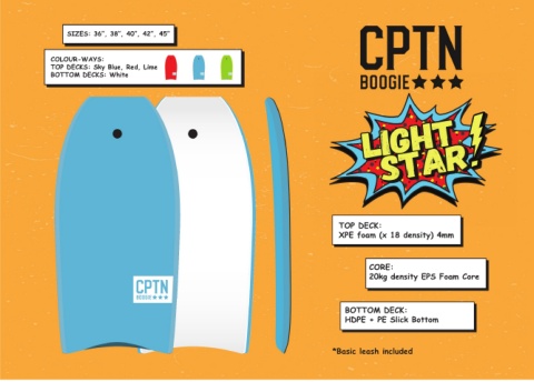 SIZES: 36”, 38”, 40”, 42”, 45” COLOUR-WAYS: TOP DECKS: Sky Blue, Red, Lime BOTTOM DECKS: White TOP DECK: XPE foam (x 18 density) 4mm CORE: 20kg density EPS Foam Core BOTTOM DECK: HDPE + PE Slick Bottom *Basic leash included