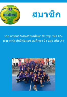 สมำชิก นาย อานนท์ วิเศษศรี พลศึกษา ป ี2 หมู่1 รหัส 024 นาย สหรัฐ ภักดีพันดอน พลศึกษา ป ี2 หมู่2 รหัส 055