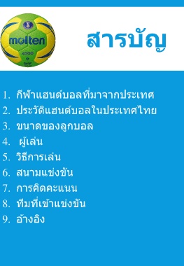 สำรบัญ 1. กีฬาแฮนด์บอลที่มาจากประเทศ 2. ประวัติแฮนด์บอลในประเทศไทย 3. ขนาดของลูกบอล 4. ผู้เล่น 5. วิธีการเล่น 6. สนามแข่งขัน 7. การคิดคะแนน 8. ทีมที่เข ้าแข่งขัน 9. อ ้างอิง