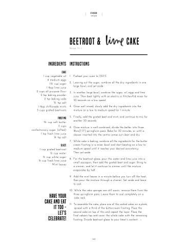 1 cup vegetable oil 4 medium eggs 11⁄2 cup sugar 1 tbsp lime juice 2 cups all purpose flour 2 tsp baking powder 2 tsp baking soda 1⁄2 tsp salt 1 tbsp chiffonade mints 3 cups grated beetroots
