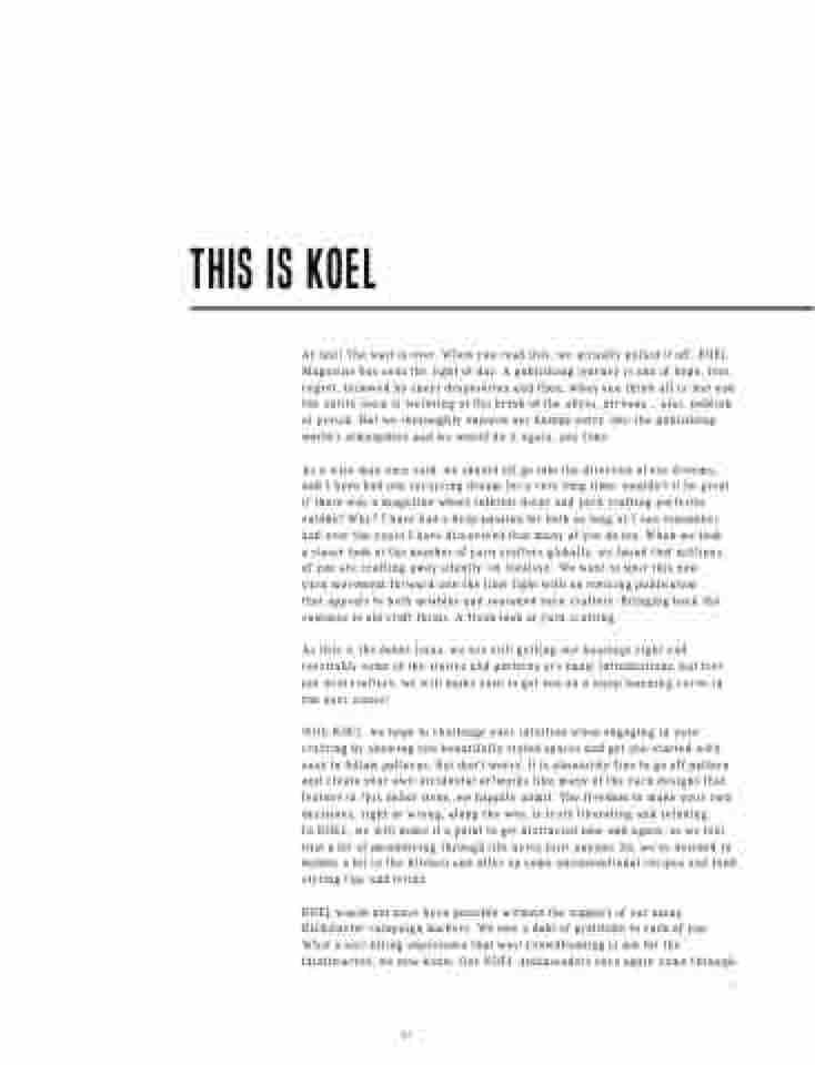 At last! The wait is over. When you read this, we actually pulled it off. KOEL Magazine has seen the light of day. A publishing journey is one of hope, fear, regret, followed by sheer desperation and then, when you think all is lost and the entire team is teetering at the brink of the abyss, nirvana... alas, publish or perish. But we thoroughly enjoyed our bumpy entry into the publishing world’s atmosphere and we would do it again, any time.
