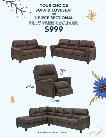 YOUR CHOICE SOFA & LOVESEAT OR 2 PIECE SECTIONAL PLUS FREE RECLINER $999 FREE! FREE! FREE! Available in Smoke and Chestnut