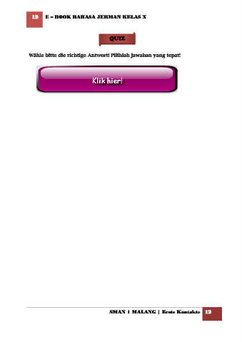 12 E – BOOK BAHASA JERMAN KELAS X QUIZ Wähle bitte die richtige Antwort! Pilihlah jawaban yang tepat! SMAN 1 MALANG | Erste Kontakte 12