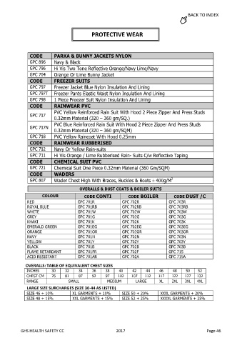 OVERALLS: TABLE OF EQUIVALENT CHEST SIZES
