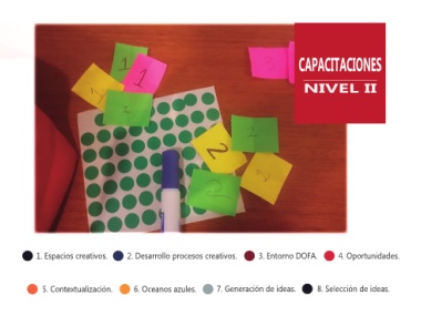 1. Espacios creativos. 2. Desarrollo procesos creativos. 3. Entorno DOFA. 4. Oportunidades. 5. Contextualización. 6. Oceanos azules. 7. Generación de ideas. 8. Selección de ideas.