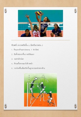 ทักษะที่ 5.กำรสกัดกั้น ( ป้องกันกำรตบ ) 1. ยืนแยกเท้ำออกประมำณ 1 ช่วงไหล่ 2. มือทั้งสองยกขึ้นกำงฝ่ำมือออก 3. งอเข่ำเล็กน้อย 4. ศีรษะตั้งตรงมองไปข้ำงหน้ำ 5. กระโดดขึ้นเพื่อสกัดกั้นลูกตบของฝ่ำยตรงข้ำม
