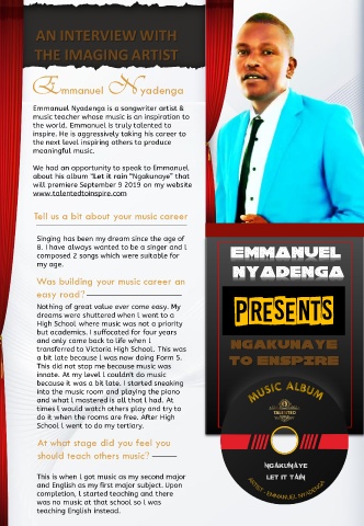 EmmanuelNyadenga Tell us a bit about your music career Emmanuel nyadenga Was building your music career an easy road? PRESENTS At what stage did you feel you should teach others music?