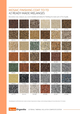 The photographs are illustrative only. In order to choose the appropriate melange, use the melange catalogue of mosaic (decorative) TO-TD plaster. The photographs are illustrative only. In order to choose the appropriate melange, use the melange catalogue of mosaic (decorative) TO-TD Art.