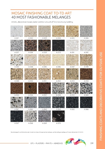 The photographs are illustrative only. In order to choose the appropriate melange, use the melange catalogue of mosaic (decorative) TO-TD plaster. The photographs are illustrative only. In order to choose the appropriate melange, use the melange catalogue of mosaic (decorative) TO-TD Art.