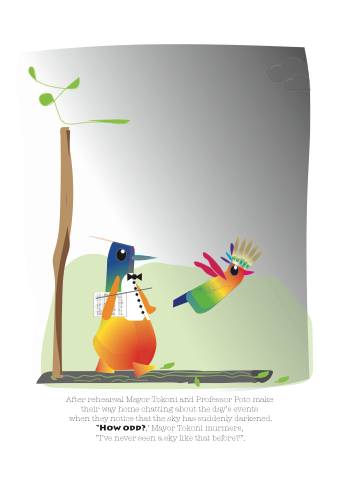 After rehearsal Mayor Tokoni and Professor Poto make their way home chatting about the day’s events when they notice that the sky has suddenly darkened. “How odd?,’ Mayor Tokoni murmers, ”I’ve never seen a sky like that before?”.