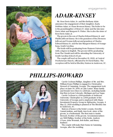 Carole Cochran is a 2014 graduate of Anderson University. Christopher is a 2014 graduate of the University of Georgia and is employed with Shane Investment Property Group in Alpharetta, Georgia. A May 23, 2020 wedding is planned at The Bleckley Inn in Anderson, SC.