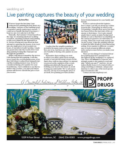 it. On top of being nervous about my first attempt at capturing the beauty of an event into one single piece of art in under six hours, it was July in South Carolina. I made my grand entry into the world of live wed- ding painting looking like I had just run through the sprinklers.