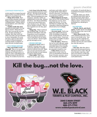 • Buy your bride a wed- ding gift. This is very personal, and you only get one shot at making a good impression, so make it count. Something from the heart is good, but don’t be cheap. It’s a token of your love.