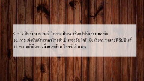 9. การเปิดรับนานาชาติ ไทยยังเป็นรองสิงคโปร์และมาเลเซีย 10. การแข่งขันด้านราคาไทยยังเป็นรองอินโดนีเซีย เวียดนามและฟิลิปปินส์ 11. ความยั่งยืนของสิ่งแวดล้อม ไทยยังเป็นรอง