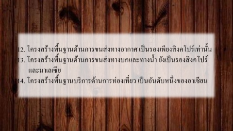 12. โครงสร้างพื้นฐานด้านการขนส่งทางอากาศ เป็นรองเพียงสิงคโปร์เท่านั้น 13. โครงสร้างพื้นฐานด้านการขนส่งทางบกและทางนํา ยังเป็นรองสิงคโปร์ ้ และมาเลเซีย 14. โครงสร้างพื้นฐานบริการด้านการท่องเที่ยว เป็นอันดับหนึ่งของอาเซียน