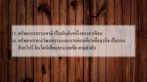 15. ทรัพยากรธรรมชาติ เป็นอันดับหนึ่งของอาเซียน 16. ทรัพยากรทางวัฒนธรรมและการท่องเที่ยวเพื่อธุรกิจ เป็นรอง สิงคโปร์ อินโดนีเซียและมาเลเซีย ตามลําดับ