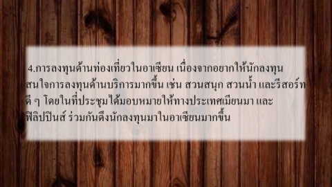 4.การลงทุนด้านท่องเที่ยวในอาเซียน เนื่องจากอยากให้นักลงทุน สนใจการลงทุนด้านบริการมากขึ้น เช่น สวนสนุก สวนนํา และร ีสอร์ท ้ ดี ๆ โดยในที่ประชุมได้มอบหมายให้ทางประเทศเมียนมา และ ฟิลิปปินส์ ร่วมกันดึงนักลงทุนมาในอาเซียนมากขึ้น