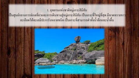 1. อุทยานแห่งชาติหมู่เกาะสิมิลัน เป็นศูนย์กลางการท่องเที่ยวและการเดินทางสู่หมู่เกาะสิมิลัน เป็นเกาะที่ใหญ่ที่สุด มีหาดทรายขาว ละเอียดใต้ทะเลมีปะการังหลายชนิด เป็นเกาะที่สามารถดําทั้งนําลึกและนําตื้น ้ ้