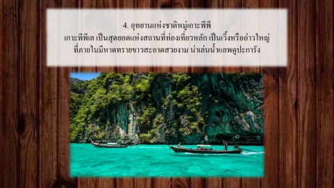 4. อุทยานแห่งชาติหมู่เกาะพีพี เกาะพีพีเล เป็นสุดยอดแห่งสถานที่ท่องเที่ยวหลัก เป็นเวิ้งหรืออ่าวใหญ่ ที่ภายในมีหาดทรายขาวสะอาดสวยงาม น่าเล่นนําแลพดูปะการัง ้