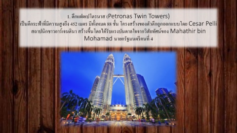 1. ตึกแฝดเปโตรนาส (Petronas Twin Towers) เป็นตึกระฟ้าที่มีความสูงถึง 452 เมตร มีทั้งหมด 88 ชั้น โครงสร้างของตัวตึกถูกออกแบบโดย Cesar Pelli สถาปนิกชาวอาร์เจนตินา สร้างขึ้นโดยได้รับแรงบันดาลใจจากวิสัยทัศน์ของ Mahathir bin Mohamad นายกรัฐมนตรีคนที่ 4