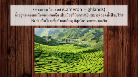 5.คาเมรอน ไฮแลนส์ (Cameron Highlands) ตั้งอยู่ทางตอนเหนือของมาเลเซีย เป็นเมืองที่มีอากาศเย็นสบายตลอดทั้งป ีชมไร่ชา Boh เป็นไร่ชาชื่อดังและใหญ่ที่สุดในประเทศมาเลเซีย