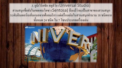 3. ยูนิเวิร์ลซัล สตูดิโอ (Universal Studio) สวนสนุกชื่อดังในเขตเซนโตซา (Sentosa) ถึงแม้ว่าจะเป็นสาขาของสวนสนุก ระดับอินเตอร์เนชั่นแนลจากฝั่งอเมริกา แต่เครื่องเล่นในสวนสนุกจํานวน 18 ชนิดจาก ทั้งหมด 24 ชนิด ใน 7 โซนประเภทเครื่องเล่น