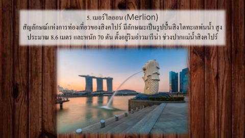 5. เมอร์ไลออน (Merlion) สัญลักษณ์แห่งการท่องเที่ยวของสิงคโปร์ มีลักษณะเป็นรูปปั้นสิงโตทะเลพ่นนํา สูง ้ ประมาณ 8.6 เมตร และหนัก 70 ตัน ตั้งอยู่ริมอ่าวมารีน่า ช่วงปากแม่นําสิงคโปร์ ้