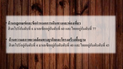 * ด้านกฎเกณฑ์และข้อกําหนดการเดินทางและท่องเที่ยว สิงคโปร์อันดับที่ 6 มาเลเซียอยู่อันดับที่ 60 และไทยอยู่อันดับที่ 77 * ด้านความสภาพแวดล้อมทางธุรกิจและโครงสร้างพื้นฐาน สิงคโปร์อยู่อันดับที่ 4 มาเลเซียอยู่อันดับดับที่ 40 และไทยอยู่อันดับดับที่ 43