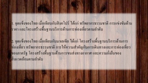 1. จุดแข็งของไทย เมื่อเทียบกับสิงคโปร์ ได้แก่ ทรัพยากรธรรมชาติ การแข่งขันด้าน