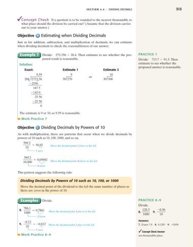 Example 7 Divide: 272.356 , 28.4. Then estimate to see whether the pro- PRACTICE 7