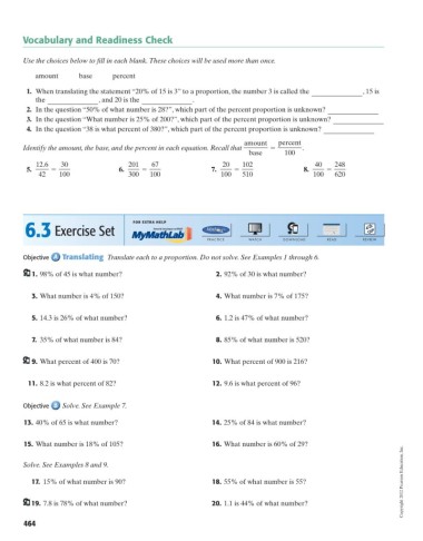 1. When translating the statement “20% of 15 is 3” to a proportion, the number 3 is called the , 15 is