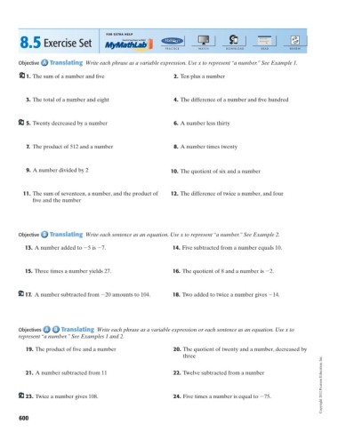 Objective Translating Write each phrase as a variable expression. Use x to represent “a number.” See Example 1.