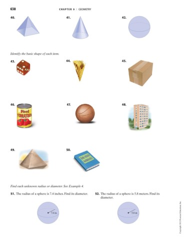 51. The radius of a sphere is 7.4 inches. Find its diameter. 52. The radius of a sphere is 5.8 meters. Find its