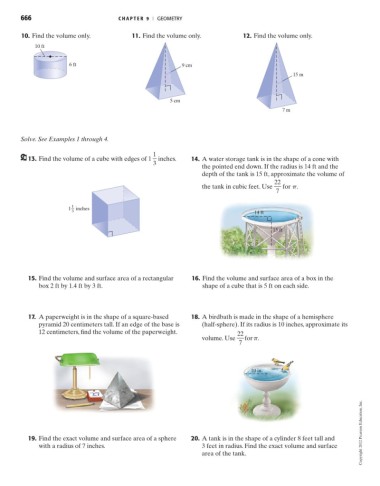 13. Find the volume of a cube with edges of 1 inches. 14. A water storage tank is in the shape of a cone with