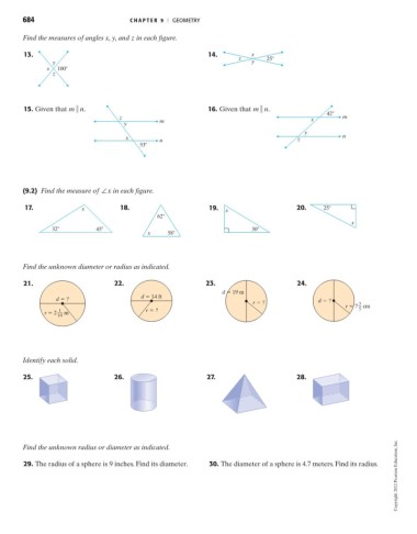 29. The radius of a sphere is 9 inches. Find its diameter. 30. The diameter of a sphere is 4.7 meters. Find its radius.