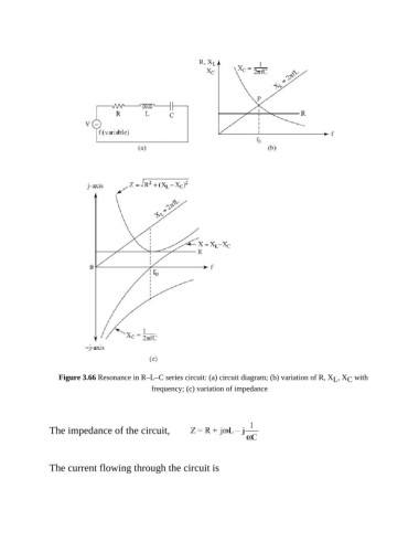 Figure 3.66 Resonance in R–L–C series circuit: (a) circuit diagram; (b) variation of R, X , X with L C frequency; (c) variation of impedance The impedance of the circuit, The current flowing through the circuit is