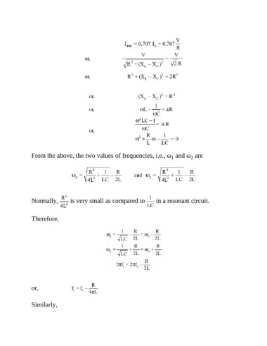 From the above, the two values of frequencies, i.e., ω and ω are 1 2 Normally, is very small as compared to in a resonant circuit. Therefore, or, Similarly,