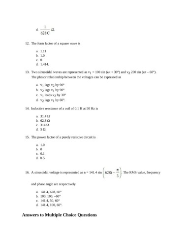 16. A sinusoidal voltage is represented as n = 141.4 sin . The RMS value, frequency