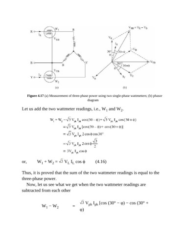 Figure 4.17 (a) Measurement of three-phase power using two single-phase wattmetters; (b) phasor