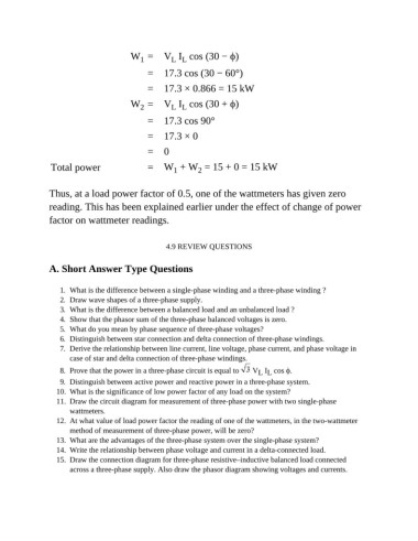 12. At what value of load power factor the reading of one of the wattmeters, in the two-wattmeter