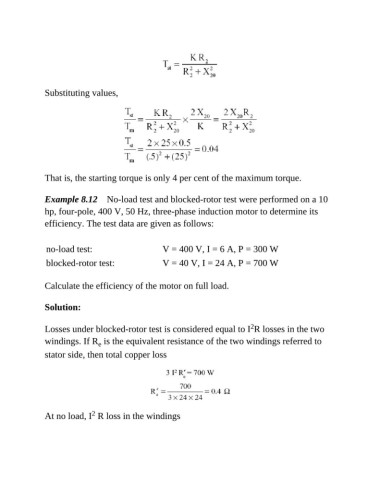 Example 8.12 No-load test and blocked-rotor test were performed on a 10