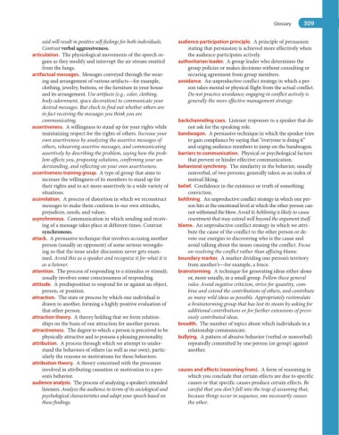 ing of a message takes place at different times. Contrast blame. An unproductive conflict strategy in which we attri-