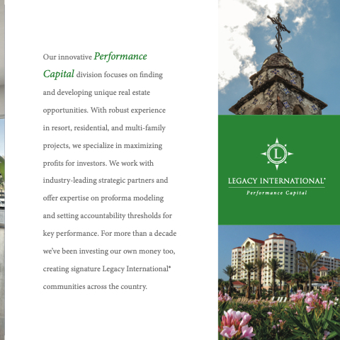 in resort, residential, and multi-family projects, we specialize in maximizing profits for investors. We work with industry-leading strategic partners and offer expertise on proforma modeling and setting accountability thresholds for key performance. For more than a decade we’ve been investing our own money too, creating signature Legacy International® communities across the country.