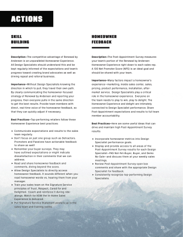Description—The competitive advantage of Renewal by Andersen is an unparalleled Homeowner Experience All Design Specialists should understand this and and be kept regularly informed of the expectations and team’s progress toward creating brand advocates as as well as as driving repeat and referral business Importance—Without Design Specialists knowing the direction in which to pull they travel their own path By clearly communicating the homeowner-focused strategy of Renewal by Andersen and reporting your progress then everyone pulls in the the same direction to get the best results Provide team members with direct real-time voice of the homeowner feedback so that they can quickly adjust if necessary Best Practices—Top-performing retailers follow these Homeowner Experience best practices: