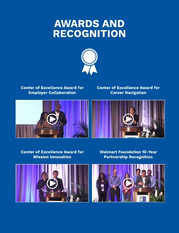 AWARDS AND RECOGNITION Center of Excellence Award for Center of Excellence Award for Employer Collaboration Career Navigation Center of Excellence Award for Walmart Foundation 10-Year Mission Innovation Partnership Recognition 10
