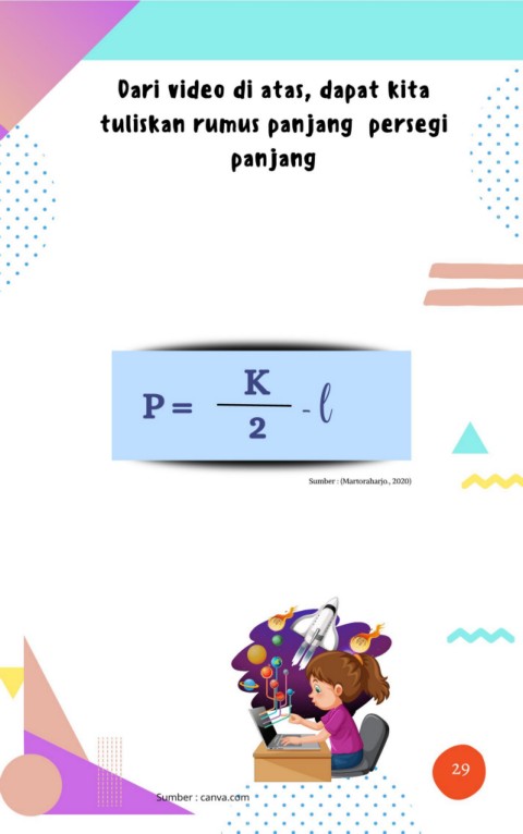 Dari video di atas, dapat kita tuliskan rumus panjang persegi panjang K P = - l 2 Sumber : (Martoraharjo., 2020) 17 29 Sumber : canva.com