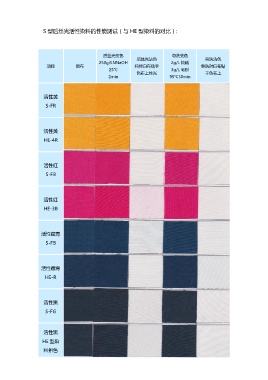 S 型后丝光活性染料的性能测试(与 HE 型染料的对比): 后丝光变色 皂洗变色 250g/LNNaOH 后丝光沾色 2g/L 纯碱 皂洗沾色 项目 原布 纯棉白布贴于 皂洗时白布贴 25℃ 色布上丝光 3g/L 皂粉 于色布上 2min 95℃30min 活性黄 S-FR 活性黄 HE-4R 活性红 S-FB 活性红 HE-3B 活性藏青 S-FB 活性藏青 HE-R 活性黑 S-FG 活性黑 HE 型染 料拼色