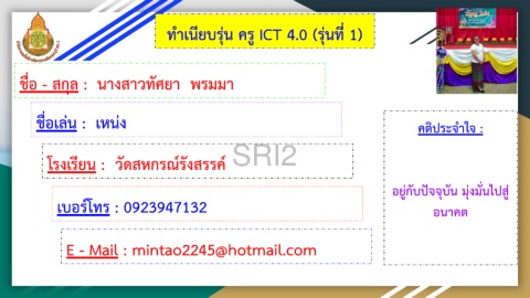 ทําเนียบรุน ครู ICT 4.0 (รุนที่ 1) ชื่อ - สกุล : นางสาวทัศยา พรมมา รูปภาพ ชื่อเลน : เหนง คติประจําใจ : SRI2 โรงเรียน : วัดสหกรณรังสรรค อยูกับปจจุบัน มุงมั่นไปสู เบอรโทร : 0923947132 อนาคต E - Mail : mintao2245@hotmail.com