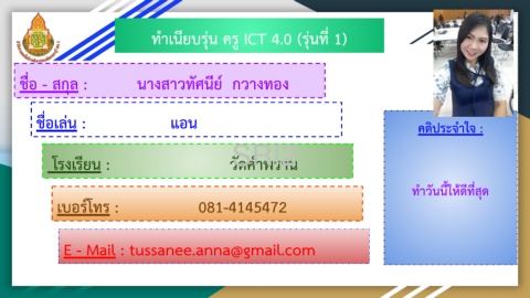 ทําเนียบรุน ครู ICT 4.0 (รุนที่ 1) ชื่อ - สกุล : นางสาวทัศนีย กวางทอง รูปภาพ ชื่อเลน : แอน คติประจําใจ : SRI2 โรงเรียน : วัดคําพราน ทําวันนี้ใหดีที่สุด เบอรโทร : 081-4145472 E - Mail : tussanee.anna@gmail.com