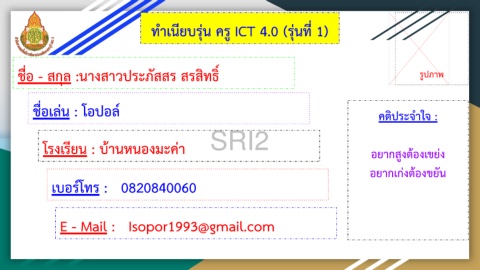 ทําเนียบรุน ครู ICT 4.0 (รุนที่ 1) ชื่อ - สกุล :นางสาวประภัสสร สรสิทธิ์ รูปภาพ ชื่อเลน : โอปอล คติประจําใจ : SRI2 โรงเรียน : บานหนองมะคา อยากสูงตองเขยง อยากเกงตองขยัน เบอรโทร : 0820840060 E - Mail : Isopor1993@gmail.com